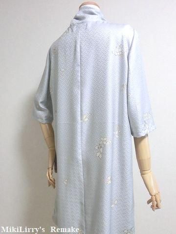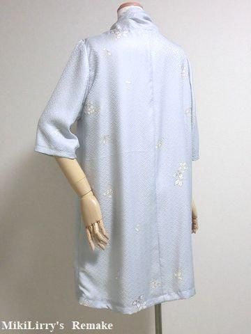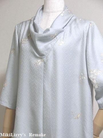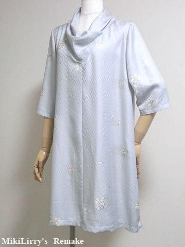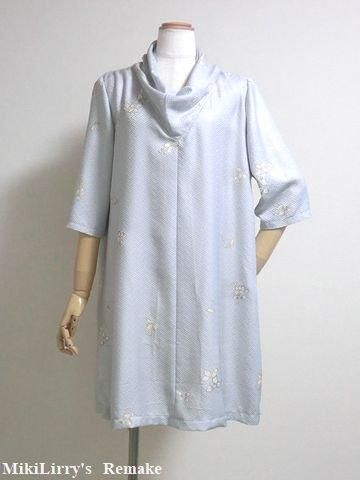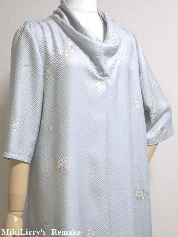 着物リメイク✿白銅色に地紋と小花模様がはいった小紋からのドレープネックチュニック