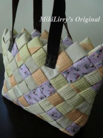 芯に布をかぶせて斜めに編み込みをしたバッグで、個性的なデザインになり、
