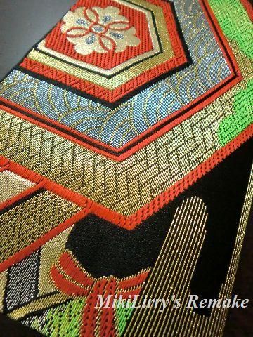 黒地に亀甲と菊の模様が入った錦織の帯をそのままリメイクに。