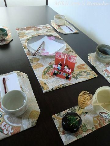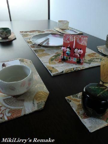 帯リメイク✿扇と茶屋辻文様のテーブルセンター&マット4枚のセット